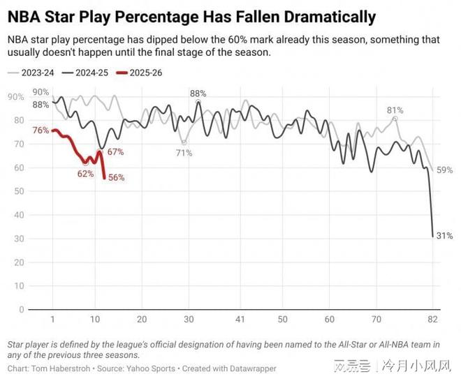 今日,据记者Tom Haberstroh统计报道,本赛季至今球星们(过去三个赛季入选过全明星或最佳阵容的球员)的缺勤场次已经超过了200场,出勤率跌破了六成,只有56%。值得一提的是,去年同期出勤率为67%,前年则是87%。据统计,本赛季共有45位球员符合球星的定义标准,这意味着平均每位球星至少将缺席五场比赛。即便是去掉那些因为大伤早就确定长期缺席的球星们(比如接受手术的欧文、塔图姆等人),明星们的出勤率也只有75%。